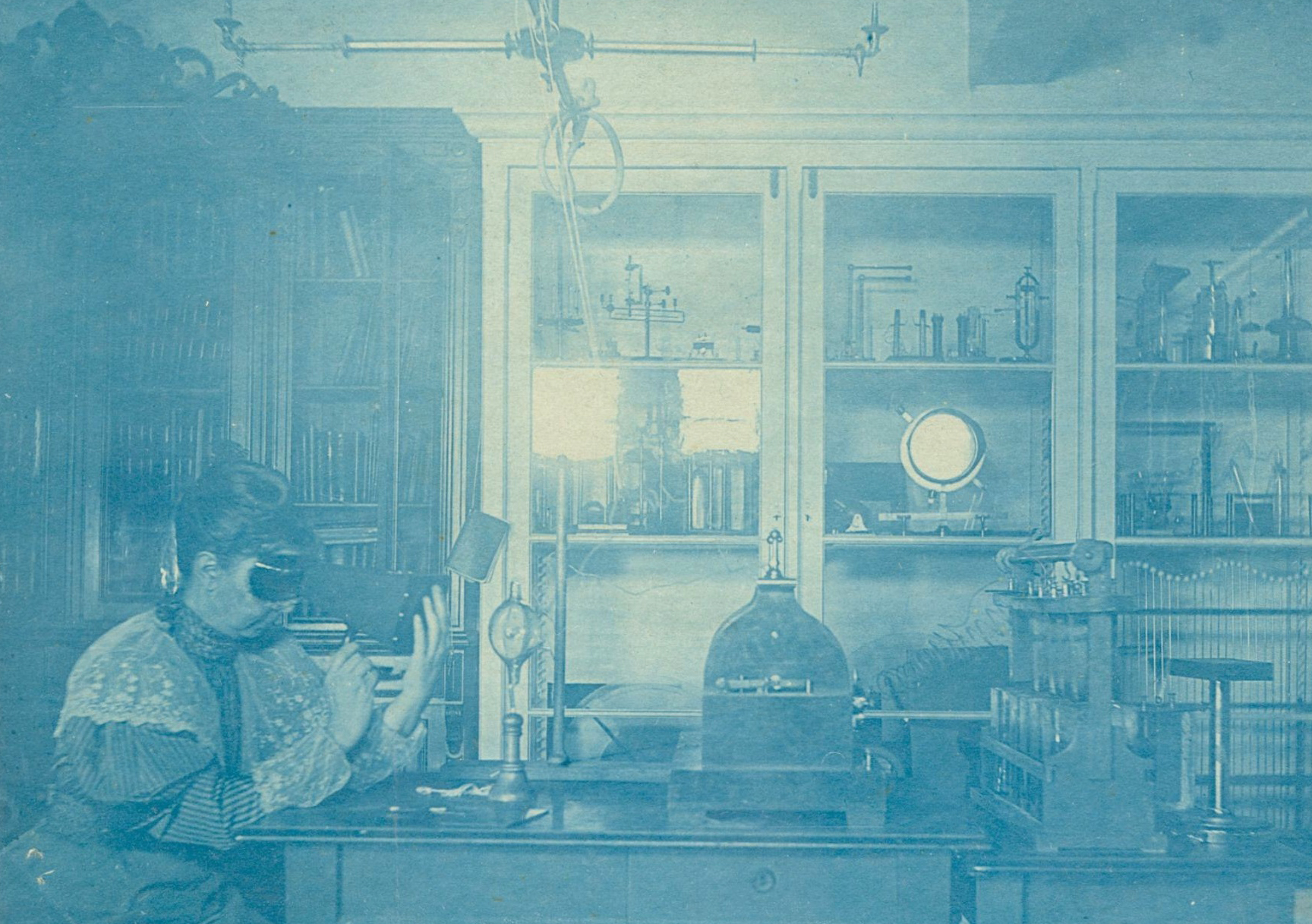 Sarah Frances Whiting xem xương bàn tay của mình bằng huỳnh quang nghiệm trong phòng thí nghiệm vật lý của Đại học Wellesley, khoảng 1896. Trên mặt bàn trước mặt bà là một ống Crookes được gắn trên giá và một cuộn Ruhmkorff để điều chỉnh điện áp.