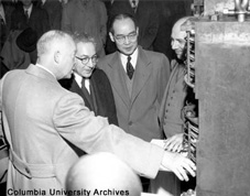 ![]() Eisenhower, Rabi (giữa) và giáo sư khách mời Hideki Yukawa trong khu vực máy gia tốc ở Đại học Columbia. |