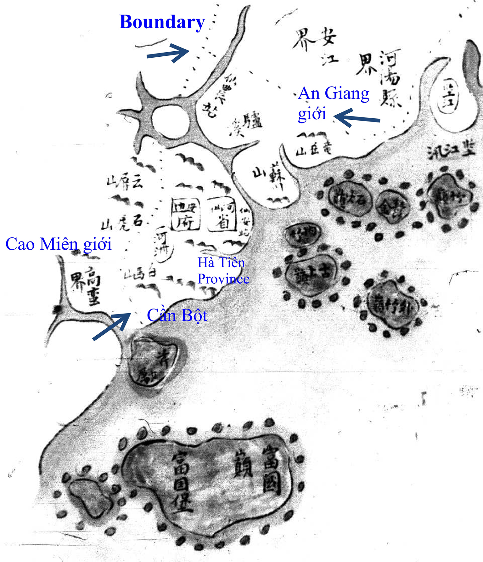 Đường ranh giới Việt Nam-Cao Miên trên bản đồ tỉnh An Giang. Nguồn: “Đại Nam Nhất Thống Dư Đồ” (1861, EFEO microfilm, A.1600, 76a).