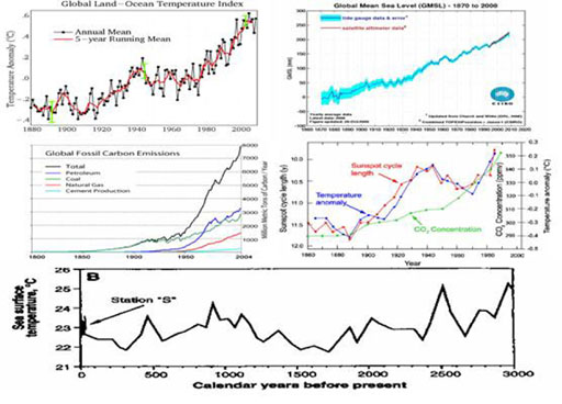 Hình 1. Nhiệt độ trái đất (hình trên bên trái), mực nước biển (hình trên bên phải) và hàm lượng các khí gây hiệu ứng nhà kính (hình giữa bên trái) tăng theo thời gian trong thế kỷ 20. Sự gia tăng nhiệt độ trái đất tương quan với biến đổi chu kỳ mặt trời rõ ràng hơn so với sự gia tăng nồng độ CO2 trong không khí (hình giữa bên phải). Các giai đoạn nhiệt độ trái đất tăng trong ba nghìn năm gần đây cũng tương đương như sự gia tăng nhiệt độ trong thế kỷ 20 (hình dưới).