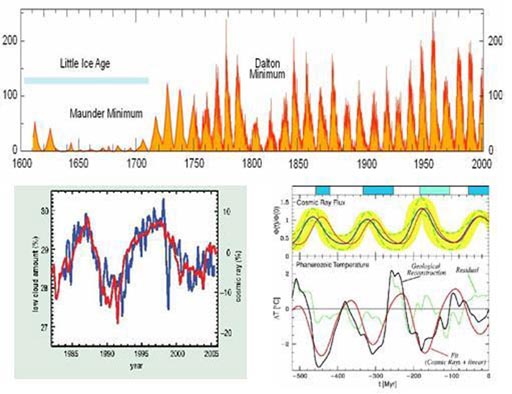 Hình 2. Mức độ hoạt động của Mặt trời trong bốn thế kỷ gần đây. Chu kỳ hoạt động của Mặt trời trung bình là 11 năm nhưng có hai thời kỳ (Cực tiểu Maunder và Cực tiểu Dalton) hoạt động biến đổi khá chậm chưa rõ nguyên nhân (hình trên). Mối tương quan giữa thông lượng tia vũ trụ với thăng giáng nhiệt độ (hình dưới bên phải) và với lớp mây tầng thấp (hình dưới bên trái).