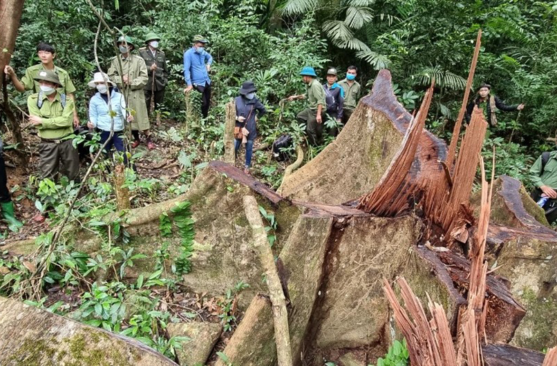 Một cây gỗ lớn nằm trong vùng lõi Khu Bảo tồn thiên nhiên Bắc Hướng Hóa bị đốn hạ còn trơ gốc. Nguồn: Báo Lao động