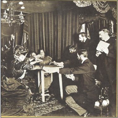 ![]() Eusapia Palladino trong một lần điều khiển đồ vật trong phòng của Camille Flammarion, có sự tham dự của Charles Richet và Paul Sabatier. |