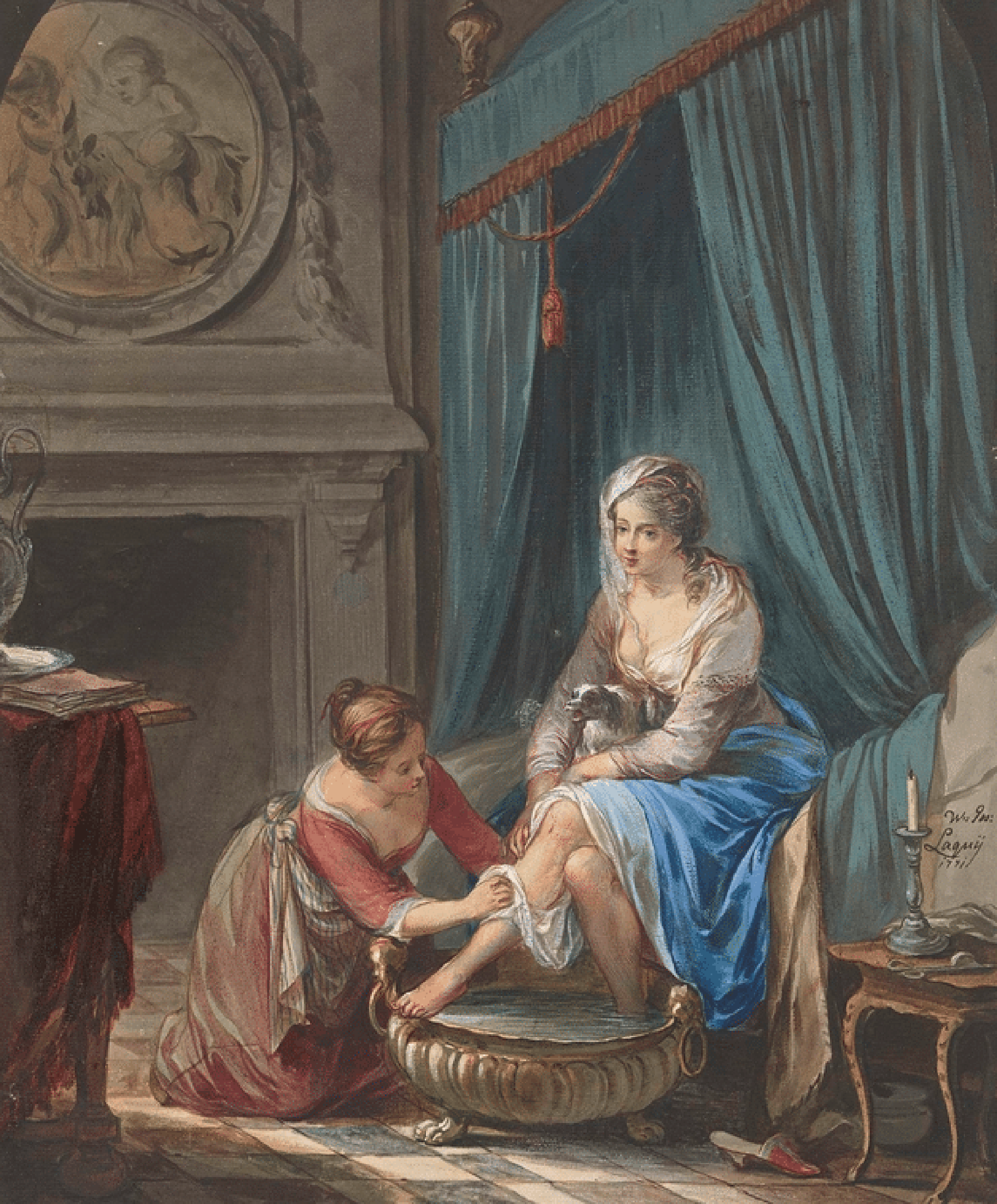Tranh vẽ về việc vệ sinh bằng chậu nhỏ đựng ít nước ở Pháp, thế kỷ 18. Willem Joseph Laquy, 1771. Nguồn: https://plume-dhistoire.fr/