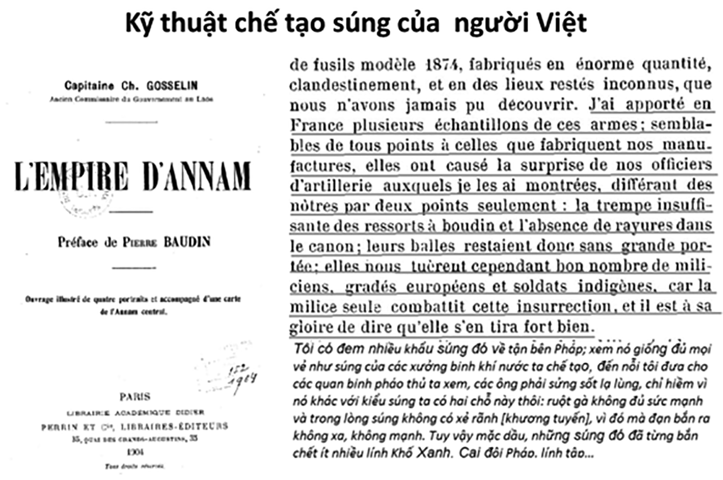 “Tôi có đem nhiều khẩu súng đó về tận bên Pháp; xem nó giống đủ mọi vẻ như súng của các xưởng binh khí nước ta chế tạo, đến nỗi tôi đưa cho các quan binh pháo thủ ta xem, các ông phải sửng sốt lạ lùng, […] những súng đó đã từng bắn chết ít nhiều lính Khố Xanh, Cai đội Pháp, lính tập…”