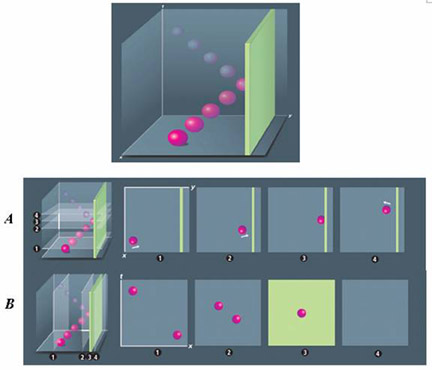 B / Nếu dùng phép cắt lát thứ hai (cắt dọc) không theo hướng quá khứ tương lai mà theo hướng từ trái sang phải. Mỗi lát cắt vừa là một phần không gian vừa là một phần thời gian. Bên trái bức tường quả bóng xuất hiện ở hai vị trí còn bên phải bức tường quả bóng không xuất hiện.