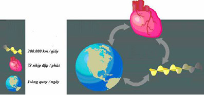Hình 2a. Bên trái hình vẽ ta dùng thời gian để đo tốc độ ánh sáng, nhịp đập của quả tim và vận tốc quay của một hành tinh và thu được theo thứ tự: 300.000 km/giây,73 nhịp đập/phút, 1vòng quay/ngày. Bên phải hình vẽ ta không dùng đến thời gian nữa và lấy một nhịp đập của trái tim làm đơn vị thì thu được theo thứ tự: 240.000 km/nhịp đập, 1 nhịp đập và 108.000 nhịp đập/1 vòng quay.