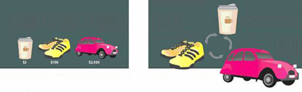 Hình 2b. Bên trái hình vẽ ta dùng đồng USD để tính giá trị của một cốc cà phê, 1 đôi giày và một chiếc ô tô đã qua sử dụng và thu được theo thứ tự: 2USD, 100USD và 2000 USD. Bên phải hình vẽ lấy giá trị một cốc cà phê làm đơn vị ta thu được theo thứ tự: 1 cốc cà phê,50 cốc cà phê / 1 đôi giày và 1000 cốc cà phê/một chiếc ô tô đã qua sử dụng.