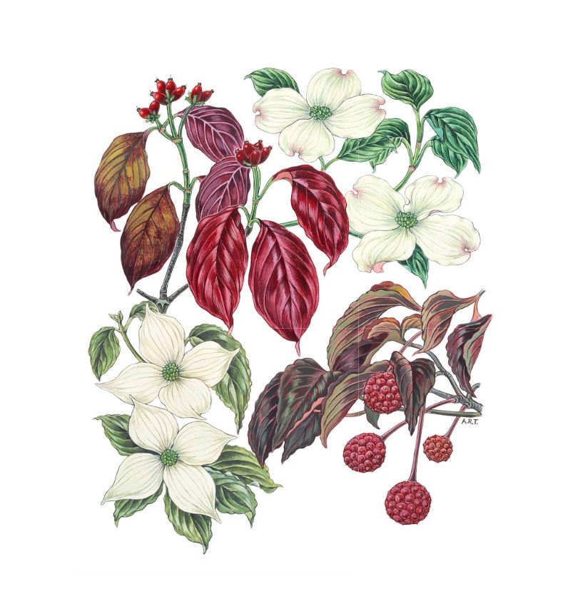 Minh họa cây Cornus kousa của Alice Tangerini, còn có tên gọi khác là sơn thù du Nhật Bản, một loài cây rụng lá nhỏ cao tối đa là 12 m, hoa trắng và quả giống như quả mâm xôi. Ảnh: Bảo tàng Lịch sử tự nhiên quốc gia Smithsonian