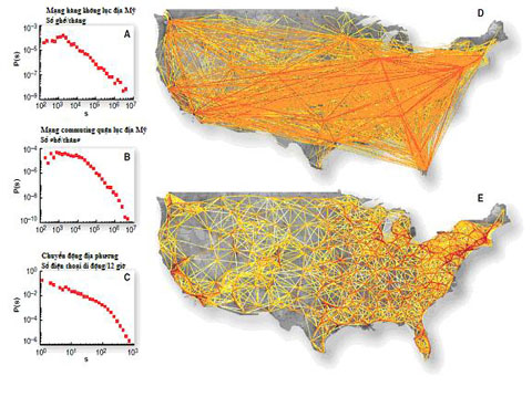 Hình 1. Các tính chất đa-thang độ của các mạng chuyển động. Bên trái, chúng tôi giới thiệu hàm phân bố xác suất P(s) cho lưu lượng, được đo bằng số các cá nhân di chuyển, trên bất cứ chuyến nối tiếp cho trước nào, của ba mạng khác biệt: (A) mạng hàng không châu lục Mỹ, (B) mạng hàng không đi lại hàng ngày gữa các quận ở Mỹ (county commuting), và (C) sự chuyển động giữa các trạm phát sóng điện thoại di động trong một khu vực đô thị lớn. Trong mọi trường hợp các hàm phân bố bị lệch (skewed) cao độ và trải từ ba đến bảy bậc độ lớn. Bên phải, chúng tôi giới thiệu minh họa về mạng hàng không châu lục Mỹ (D) và mạng commuting (E) giữa các vùng điều tra dân số chính. Thang màu từ vàng cho đến đỏ sẫm biểu hiện độ lớn dòng lưu lượng theo thang logarith. Mạng hàng không chủ yếu do các chuyến nối tiếp tầm dài tạo thành như so với trật tự giống ô lưới của mạng commuting. Lưu lượng trung bình hàng ngày của mạng commuting có độ lớn hơn lưu lượng tương ứng của mạng hàng không một bậc (10 lần).