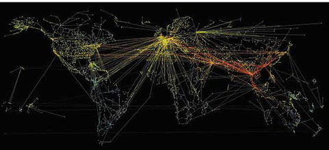 Như thế, tính phức tạp của các hệ thống kỹ thuật-xã hội đòi hỏi một tư duy “mạng”. Sự mô tả quy mô lớn của sự lan truyền bệnh truyền nhiễm cho một thí dụ đơn giản. Sự lan truyền của đại dịch hạch trong thế kỷ thứ 14 (the Black Death-Thảm họa Đen) (26) đã chủ yếu là một hiện tượng khuếch tán không gian. Những nghiên cứu lịch sử đã xác lập rằng sự lan truyền bệnh tuân theo một hình mẫu đơn giản mà có thể mô tả một cách thỏa đáng về mặt toán học bên trong khung khổ của các phương trình vi phân liên tục với các số hạng mô tả sự khuếch tán. Như đã được đoán trước trong năm 1933 (27), tác động quy mô lớn và về mặt địa lý của các bệnh lây nhiễm [như bệnh dịch SARS (28) hay cúm heo hiện thời] lên các quần thể dân cư trong thế giới hiện đại chủ yếu là do di chuyển bằng hàng không thương mại. Một bệnh dịch bắt đầu ở Đông Nam Á sẽ nhanh chóng đến Bắc Mỹ và Châu Âu (Hình 2). Bức tranh này, vì thế, không thể được mô tả đơn giản bằng các hiện tượng khuếch tán; đúng hơn, nó phải hợp nhất cấu trúc không gian của các mạng giao thông hiện đại. Thí dụ, chính bản chất đuôi-nặng (heavy-tailed, hay flat-tailed đuôi-bẹt, tức là theo phân bố scale-free) của mạng giao thông hàng không là cái giải thích vì sao riêng những sự hạn chế đi lại là không hữu hiệu trong kiềm chế bệnh dịch trừ phi tốc độ chuyển động được giảm ít nhất một bậc độ lớn [1 bậc ~ 10 lần] (29–31).