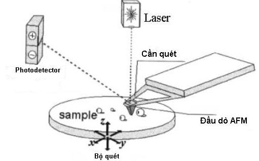 Các AFM điển hình sử dụng một hệ photodetector mà trong đó đầu dò được gắn với bên dưới của một cần quét phản xạ. Một tia laser được chiếu vào mặt phản xạ của cần quét. Khi đầu dò quét lên bề mặt mẫu, do sự mấp mô, nó sẽ rung động theo trục z, chùm laser phản xạ trên cần quét sẽ bị xê dịch tương ứng với rung động đó. Đặc trưng dao động của chùm laser phản xạ sẽ được hệ thống photodetector ghi lại và chuyển thành tín hiệu điện thế. Tín hiệu điện thế lại được xử lý và diễn giải theo chiều cao z đặc trưng cho tính chất địa hình của mẫu. Quá trình hồi tiếp sự khác nhau về tín hiệu giữa những cảm biến quang học, qua sự xử lý của phần mềm máy tính, cho phép duy trì hoặc là một lực không đổi, hoặc là một độ cao không đổi trên bề mặt mẫu.