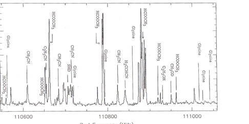 Phân tử quay và rung động nên phát ra những vạch phổ trên bước sóng hồng ngoại và vô tuyến. Sự chuyển động vi mô của phân tử và những đặc trưng cuả phổ tuân theo định luật của cơ học lượng tử. Amino acid là những chuỗi phân tử hữu cơ, một đầu có nhóm chức hóa học amin NH2 và đầu kia có nhóm chức acid COOH. Amino acid là thành phần cơ bản của chất đạm trong tế bào sinh vật. Các nhà hóa học đã điều chế được amino acid trong phòng thí nghiệm từ một hỗn hợp khí hydro, methane, amoniac và hơi nước. Hỗn hợp hóa chất này được coi là tồn tại trong khí quyển nguyên thủy của trái đất.