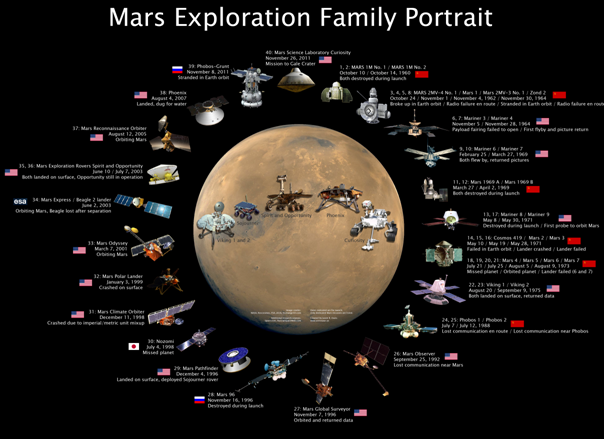 ![]() Trong 5 thập niên gần đây, hành tinh Hỏa đã từng là mục tiêu thám hiểm của nhiều tàu vũ trụ, chủ yếu phóng bởi cơ quan vũ trụ Hoa Kỳ và Nga. Nhiều vụ phóng tàu không thành công. Hiện nay chỉ có một số ít trạm tự hành di chuyển trên bề mặt hành tinh (Hình NASA). |