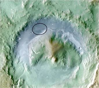 ![]() Địa hình khu vực trạm tự hành Curiosity hạ cánh (khoanh hình elip). Địa điểm hạ cánh nằm dưới đáy miệng một núi lửa và ở dưới chân một ngọn núi (màu nâu ở giữa hình) cao 5000 m (Hình NASA/JPL-Caltech). |