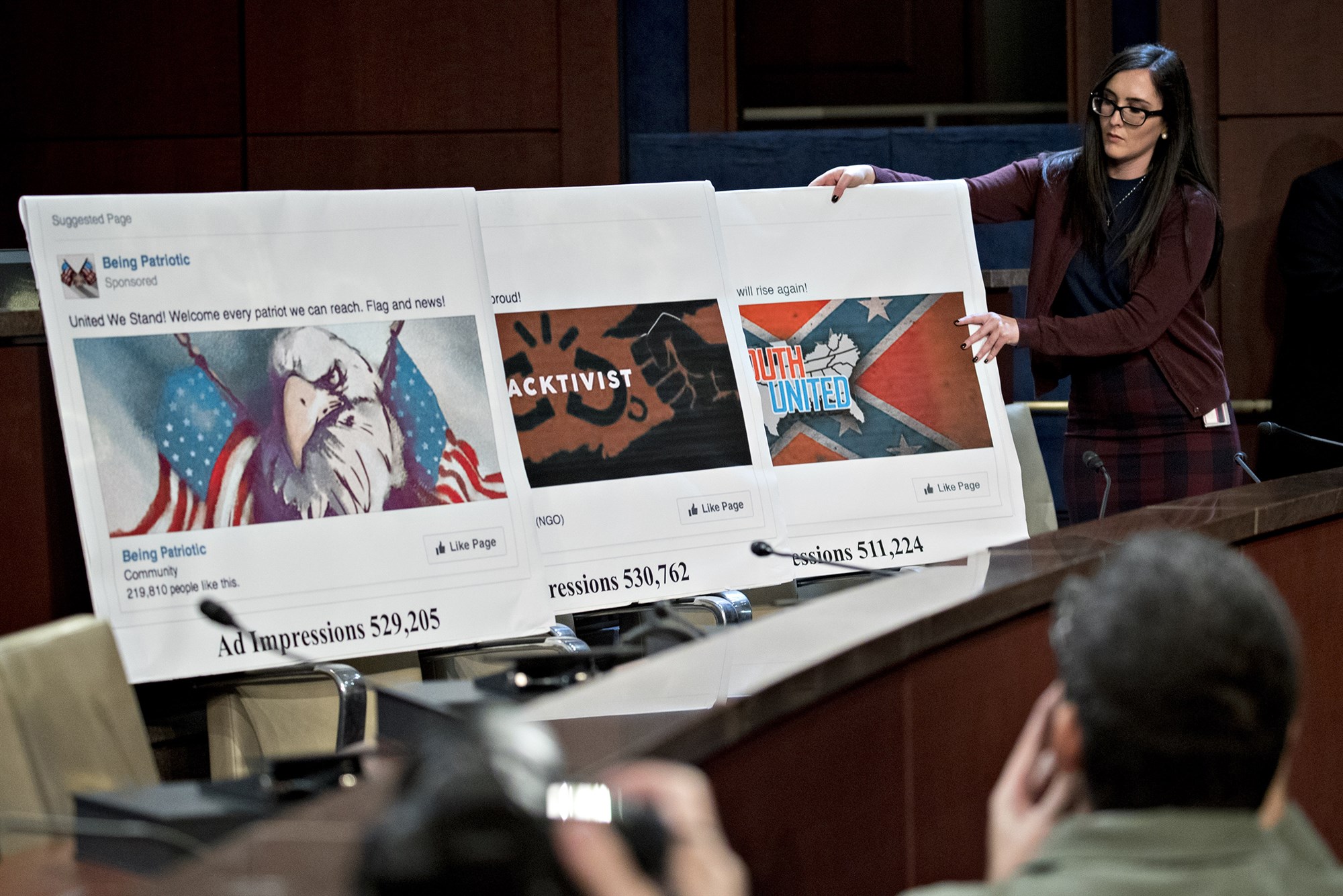 Facebook bị cáo buộc liên quan đến việc Nga tung tin để can thiệp chính trị của nước Mỹ, và giám đốc của Facebook đã phải tham gia phiên họp ngày 1 tháng 11 năm 2017 trước Ủy ban tình báo Hạ viện Mỹ. Trong ảnh là một nhân viên đang đưa ra các thông tin giả lan truyền trên facebook trước kỳ bầu cử năm 2017. Nguồn ảnh: nbcnews.