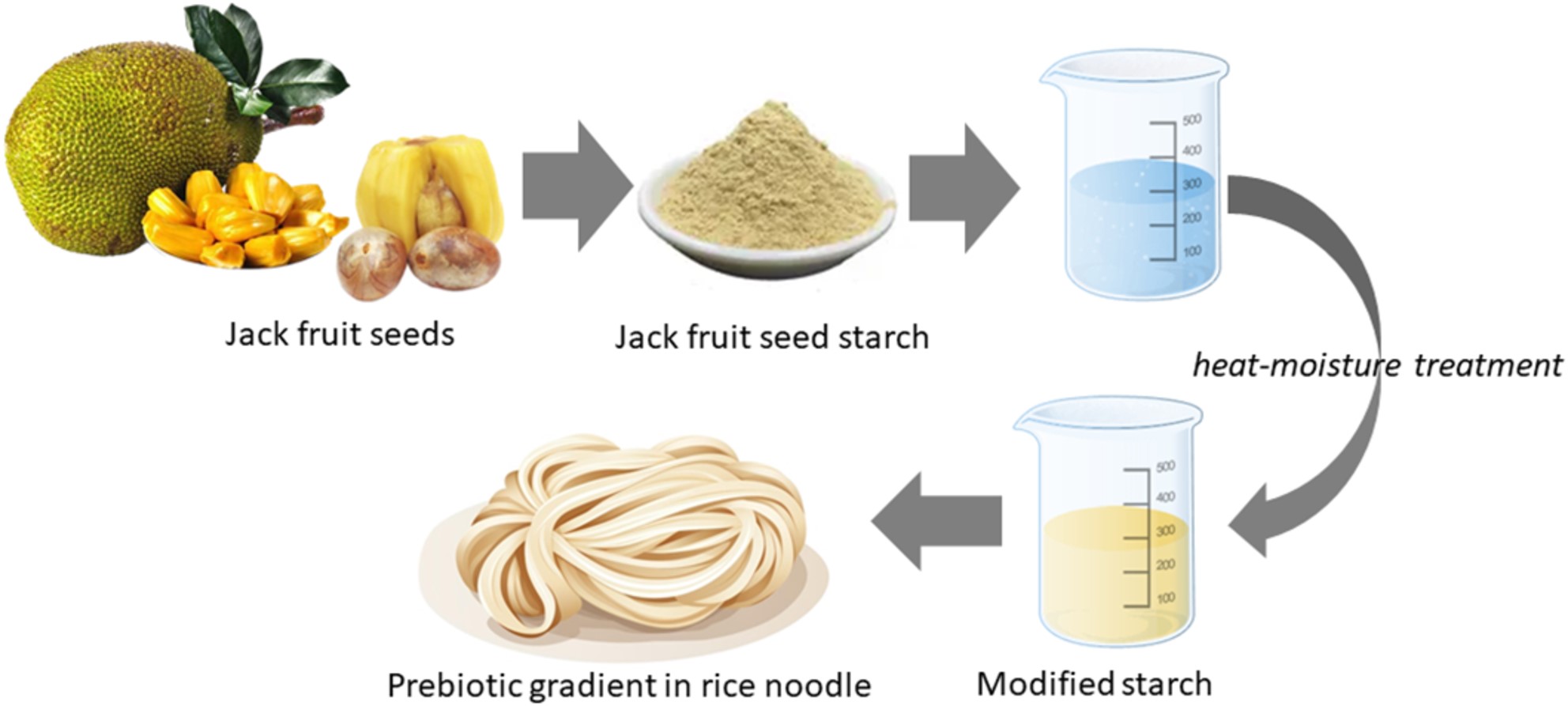 Họ sử dụng phương pháp xử lý nhiệt ẩm, một phương pháp để chế biến tinh bột kháng dạng ba để tạo sự thay đổ trong tỉ lệ tinh bột kháng dạng ba và các đặc trưng hóa lý của tỉ lệ tinh bột kháng dạng ba mà không làm thay đổi hình thái hạt tinh bột, trong đó nhiệt độ hiệu quả trên 100 °C và độ ẩm từ 10 đến 30%. Họ sử dụng hạt mít được thu thập ở Tân Phú, Đồng Nai, bột gạo Tài Ký, dầu hướng dương và muối để tạo ra một loại mì gạo như một sản phẩm thử nghiệm.