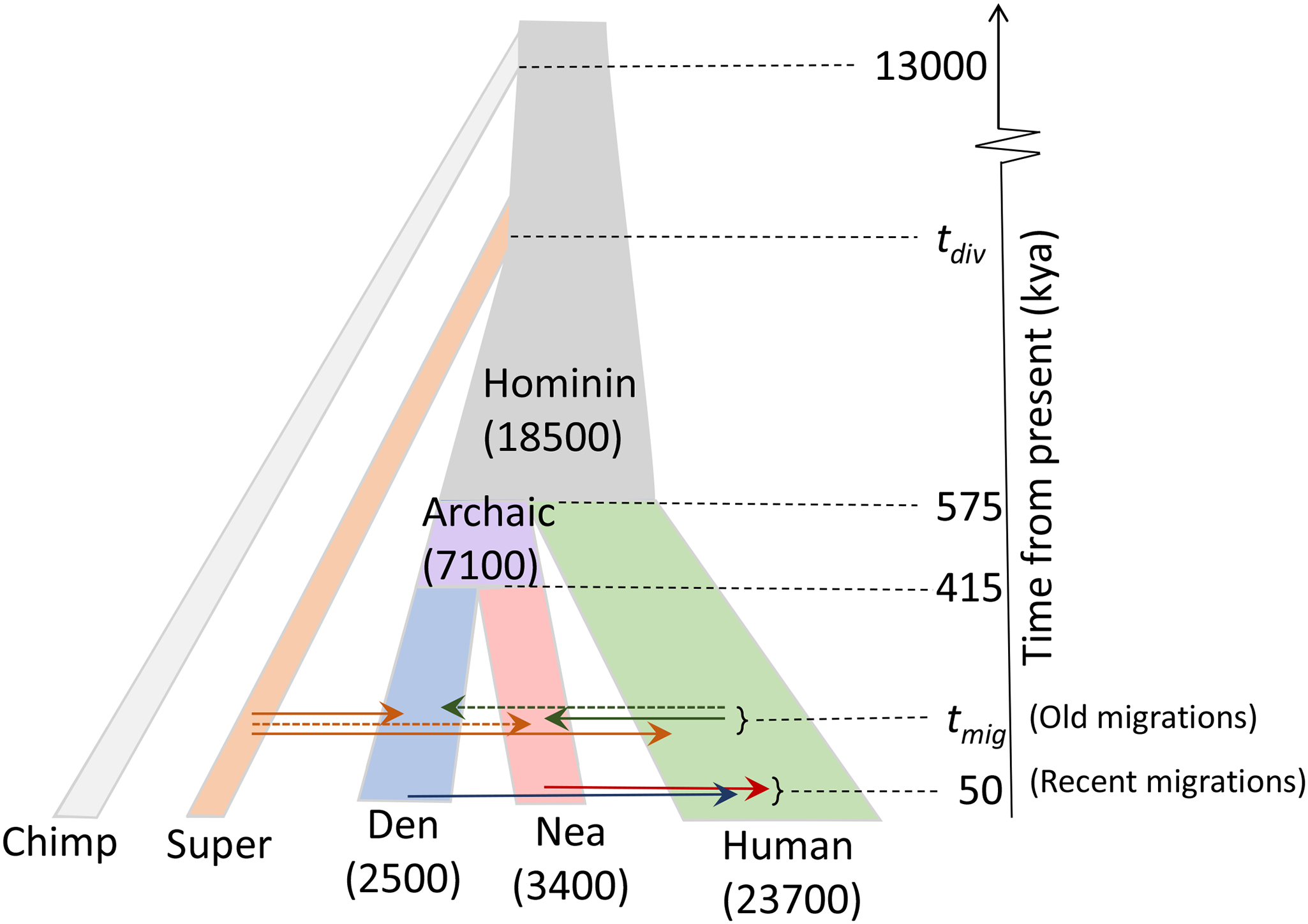 Khoảng 50.000 năm trước, một nhóm người đã di cư khỏi châu Phi và hòa huyết với người Neanderthal ở khu vực giao thoa giữa châu Âu và châu Á. Nhưng sự hòa huyết này của các tổ tiên cổ xưa của loài người và những bà con xa của họ hoán đổi DNA không chỉ diễn ra một lần duy nhất. Việc giải trình tự các hệ gene của người Neanderthal và nhóm người còn chưa được biết đến nhiều là những người Denisovan đã đem lại nhiều cái nhìn thấu suốt vào sự kiện hòa huyết và vào chuyển động của số lượng người cổ. Trong nghiên cứu mới này, các nhà nghiên cứu đã phát triển một thuật toán để phân tích các hệ gene có khả năng nhận diện được các đoạn DNA đến từ những loài khác, thậm chí nếu dòng chảy gene đó xuất hiện hàng nghìn năm trước và đến từ một nguồn còn chưa rõ. Họ sử dụng thuật toán đó để “nhìn” vào các hệ gene của hai người Neanderthal, một Denisovan và hai người châu Phi. Các nhà nghiên cứu tìm thấy bằng chứng là 3% hệ gene của người Neanderthal đến từ người cổ, và ước tính sự hòa huyết xuất hiện vào giữa thời điểm 200.000 năm và 300.000 năm trước. Hơn thế, 1% trong hệ gene Denisovan dường như đến từ một nguồn chưa rõ và là bà con xa hơn nhiều, có thể là Homo erectus, và khoảng 15% của những vùng “tối cổ” đó có thể đã được truyền sang người hiện đại đang sống ngày nay.
