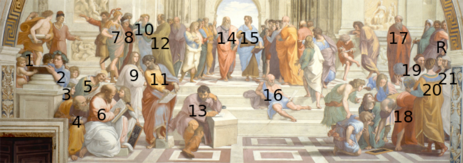 Pythagoras (6), Socrates (12), Plato (14), Aristotle (15) và Euclid hoặc Archimedes (18).