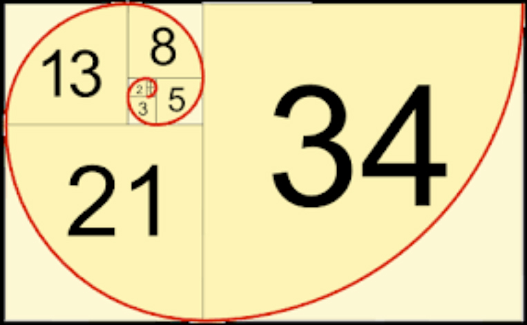 chuỗi Fibonacci biểu diễn thành kích thước các hình vuông (phải) theo một tỉ lệ xấp xỉ tỉ lệ Vàng.