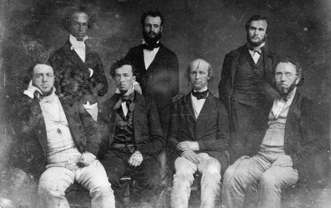 Đội ngũ biên tập của tờ New York Tribune trong khoảng thập niên 1850. Horace Greeley ngồi thứ 3 từ trái sang. Charles a. Dana đứng ở giữa. (Mathew Brady/Library of Congress).