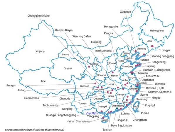 Bản đồ các vị trị xây dựng nhà máy điện hạt nhân của Trung Quốc (Nguồn: Viện nghiên cứu Tepia – 2008).