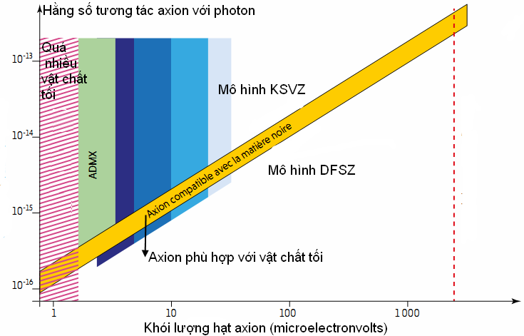 Trên hình 1 là kết quả dự đoán trong quá trình nghiên cứu khối lượng của axion theo các mô hình khác nhau, ta có hệ số (hằng số) tương tác của axion với photon như hàm của khối lượng axion. Vùng chéo màu vàng ứng với các điều kiện để axion là ứng viên tốt của vật chất tối. Nếu khối lượng axion quá bé thì quá nhiều axion được tạo nên trong thời Big Bang và chúng ta có quá nhiều vật chất tối (vùng gách chéo đỏ). Thí nghiệm ADXM cho kết quả ở vùng màu xanh nhạt sau vùng gạch chéo đỏ. Vật chất trong vũ trụ được phân bố như trong hình 2.