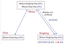 Trên thực tế, như đã được công bố trong bài báo mới đây trên Physical Review Letters 120, 030501 (2018)], vệ tinh Micius được xem như một trạm trung chuyển tin cậy để thiết lập các khoá mật mã giữa các trạm trên mặt đất. Hình 2 minh họa sự chia sẻ khóa lượng tử giữa các trạm ở Xinglong và Graz. Ký hiệu các khóa mật mã có cùng độ dài mà vệ tinh Micius thiết lập giữa Micius và Xinglong là MX và giữa Micius và Graz là MG. Vệ tinh Micius có thể thực hiện phép tính XOR (⊕) giữa từng cặp bit của MX và MG để tạo ra một khóa mới là MX⊕MG. Khóa MX⊕MG này có thể được gửi qua một kênh truyền thông cổ điển đến Xinglong (hoặc Graz). Người ở Xinglong (hoặc Graz) có thể biết được khóa gốc của người ở Graz (hoặc Xinglong) bằng cách tínhXOR giữa MX⊕MG và MX (hoặc MG) vì MX⊕MG⊕MX = MG (hoặc MX⊕MG⊕MG = MX). Quá trình này có thể hiểu là vệ tinh Micius sử dụng MX (MG) để mã hóaMG (MX) còn Xinglong (Graz) dùng MX (MG) của mình giải mã MX⊕MG và phục hồi MG (MX). Như vậy, không một ai khác, ngoài ba đối tác Xinglong, Graz và vệ tinh, có thể biết được khóa mật mã. Vì vệ tinh Micius được xem là một trạm trung chuyển tin cậy nên Xinglong và Graz có thể chuyển số liệu cho nhau một cách an toàn tuyệt đối, không lo bị rò rỉ thông tin cho bất kỳ một ai khác .