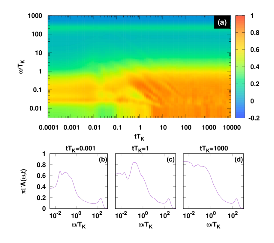 Tiến triển theo thời gian của phổ năng lượng. Đỉnh cộng hưởng Kondo hình thành sau khi bị kích thích tại mức năng lượng gần với nhiệt độ Kondo, TK, nhưng không hoàn chỉnh tại các mức năng lượng thấp hơn. Khi thời gian lớn hơn 1/ TK, đỉnh cộng hưởng Kondo hoàn chỉnh.