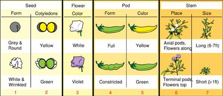 ![]() Bảng thống kê 7 tính trạng trong các thí nghiệm của Mendel |