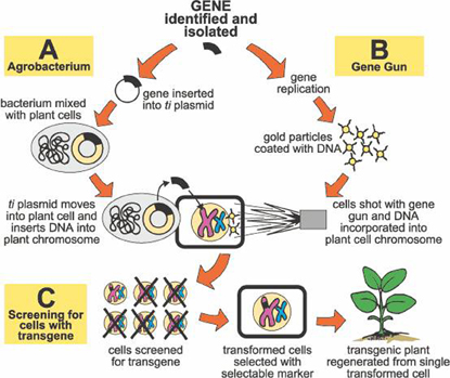 ![]() Phương pháp chuyển gene: Bên trái là cài gene mới bằng vector khuẩn (Agrobacterium) và bên phải là cài gene mới bằng súng bắn gene. |