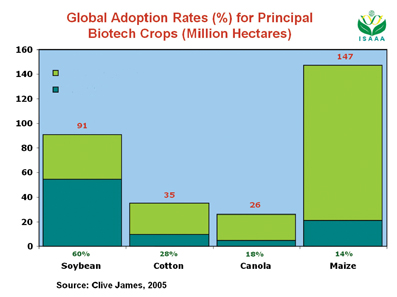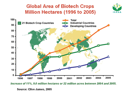 Mức độ tăng trồng cây chuyển gene trong vòng 10 năm từ 1996 tới 2005: 21 nước trồng cấy chuyển gene. Tổng diện tích trên toàn thế giới: hơn 90 triệu ha (màu da cam), trong đó các nước công nghiệp là đường màu xanh lá cây và các nước đang phát tiển là đường màu xanh lam. Riêng năm 2004 đến năm 2005 tăng 11%.