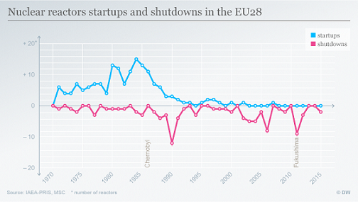 Lược đồ hiển thị tình hình các lò phản ứng hạt nhân mới xây dựng (đường màu xanh) và ngừng vận hành (đường màu đỏ) ở châu Âu.