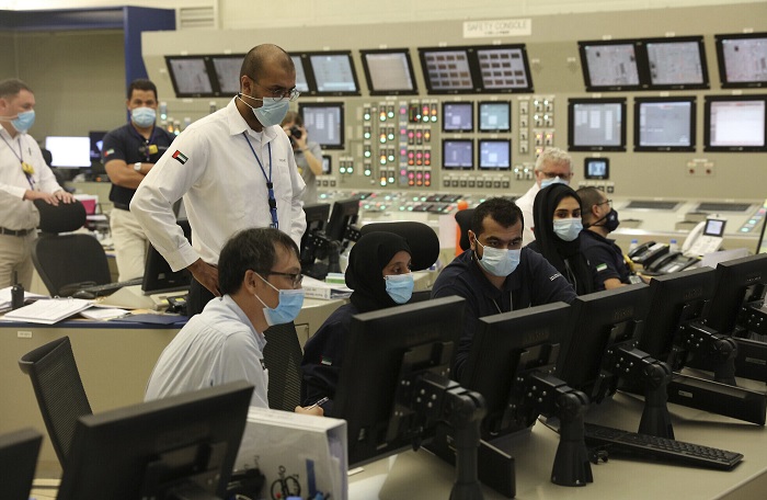Kỹ sư làm việc trong phòng vận hành lò phản ứng số một (ngày 19/8/2021) khi những megawatt điện đầu tiên từ lò phản ứng được nối lưới điện quốc gia. Nguồn: Embassy of the United Arab Emirates