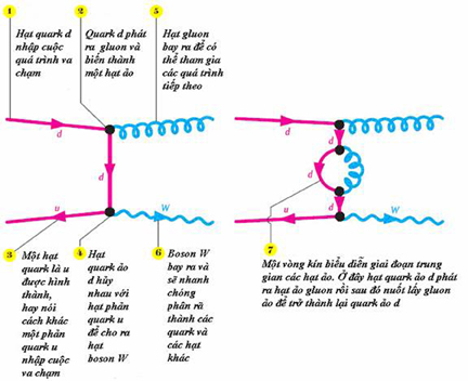 Chung quanh chúng ta các hạt cơ bản hút nhau, đẩy nhau, va chạm nhau, chuyển hóa, biến thành hạt ảo (không quan sát được) rồi trở thành hạt thực và sinh, hủy liên tục. Để hình dung các quá trình đó Richard Feynman, nhà vật lý Nobel 1965 đã sáng tạo ra các giản đồ Feynman với đường trong – mô tả hạt ảo, còn đường ngoài – hạt thực. Để hình dung được giản đồ Feynman hãy xem hình 2 và giải phẫu giản đồ này theo từng chi tiết từ 1 đến 7. Giản đồ này mô tả quá trình hai hạt quark tương tác với nhau và sinh ra một hạt gluon và một hạt boson W (đường thẳng là quark, đường cuộn tròn là gluon còn đường sóng là boson W). Ứng với mỗi đường ta có một quy tắc để viết một biểu thức giải tích và tích các biểu thức đó cho phép thực hiện tính toán xác suất quá trình tương ứng.