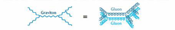 Lực mạnh được chuyển tải bởi các hạt gọi là gluon, hấp dẫn được chuyển tải bởi graviton. Bức tranh mới là graviton hành xử giống như hai gluon đan dệt với nhau (xem hình 6). Khái niệm này quả thật lạ lùng ngay cả đối với các chuyên gia cũng khó hình dung . Tuy nhiên tính chất copy kép này dẫn đến một triển vọng sáng sủa cho việc thống nhất hấp dẫn với các lực đã biết khác.
