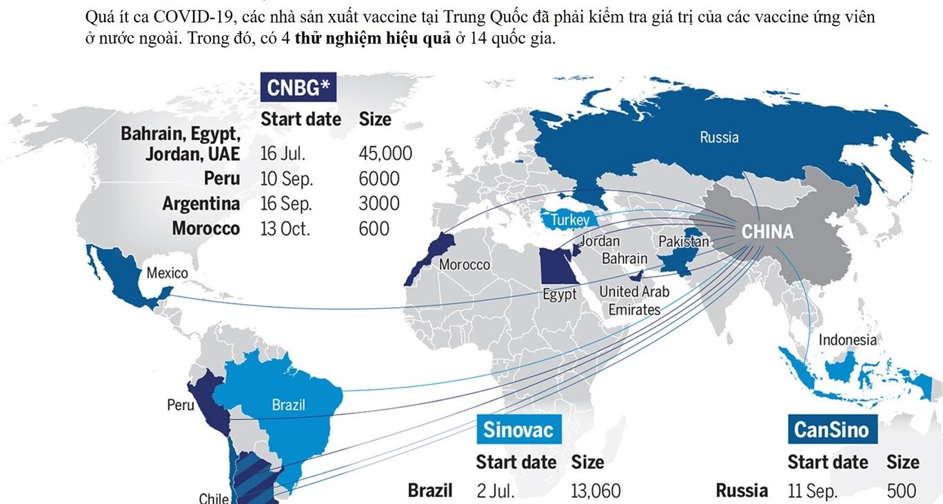 Các nhà sản xuất vaccine Trung Quốc đã kiểm tra hiệu quả của các vaccine ứng viên tại 14 nước..