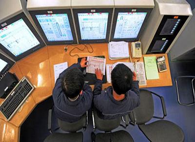 Hai kỹ thuật viên cùng vận hành và ghi chép tại phòng điều khiển nhà máy điện hạt nhân Hồng Duyên Hà (Liêu Ninh).