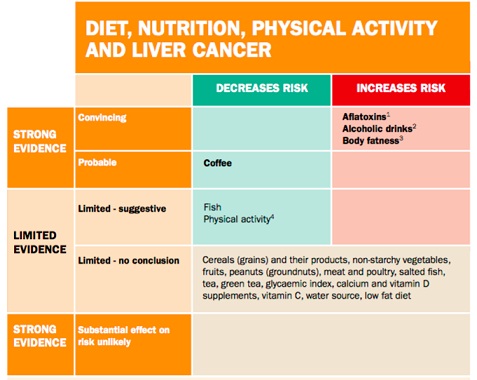 – Uống cà phê có thể làm giảm nguy cơ ung thư gan (nghiên cứu thuần tập-7, nghiên cứu bệnh chứng-4, nghiên cứu phân tích dữ liệu liều lượng-kết quả ở nam-3, ở nữ-3, chưa có bằng chứng xác thực về cơ chế hoạt động hay loại chất nào trong cà phê có tác dụng chống ung thư);