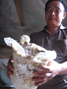“Điển hình sản xuất” mà Viện nấm ăn Côn Minh giới thiệu là ông Dương Ứng Lâm, 44 tuổi, ở làng A La, khu Quan Độ. Chỉ cách Côn Minh khoảng 15km nhưng đường đến nhà ông Dương lầy lội. Có vẻ “đường nông thôn” ở đây không được chú trọng lắm. Hùng bảo: ông Dương là một trong 5 hộ ở khu Quan Độ mua chuyển giao kỹ thuật và giống nấm của công ty anh. Song ông Dương lại nói được Viện chuyển giao kỹ thuật trồng nấm miễn phí, “vì quan hệ đặc biệt với Viện”. Không hiểu ra sao. Ông Dương mới chuyển sang trồng nấm cách đây 4 năm, trước thì làm nghề nấu rượu. Trồng nấm có lẽ cũng không vất vả lắm. Cả nhà chỉ có ông Dương làm công việc này, lúc cần thì thuê thêm 3 – 4 nhân công thời vụ. Trong diện tích rộng gần 1ha, ông Dương có đến 4 “xưởng” trồng nấm, trồng đủ các loại khác nhau. “Xưởng” trồng nấm của ông cũng tuềnh toàng, máy móc cũng thô sơ: Một máy nghiền mùn, một bể hấp giá thể. “Nhưng quy trình sản xuất rất nghiêm ngặt. Giá thể nấm ở đây đều được khử trùng, bảo đảm không có nấm độc, nấm nhiễm bệnh” – ông Dương khoe. Với nghề trồng nấm, doanh thu mỗi năm của ông Dương khoảng 100.000 NDT, nhưng thu nhập cũng lên xuống tuỳ theo thị trường, thời vụ. Nói chung nấm của ông trồng đến đâu tiêu thụ đến đấy, sản phẩm còn được xuất khẩu sang Đức, Canada, và theo ông “sang cả Việt Nam”. Tự dưng tôi nghĩ: không khéo mấy hàng lẩu nấm đắt cứa cổ ở Phan Đình Phùng, Võ Thị Sáu cũng nhập từ đây cũng nên.