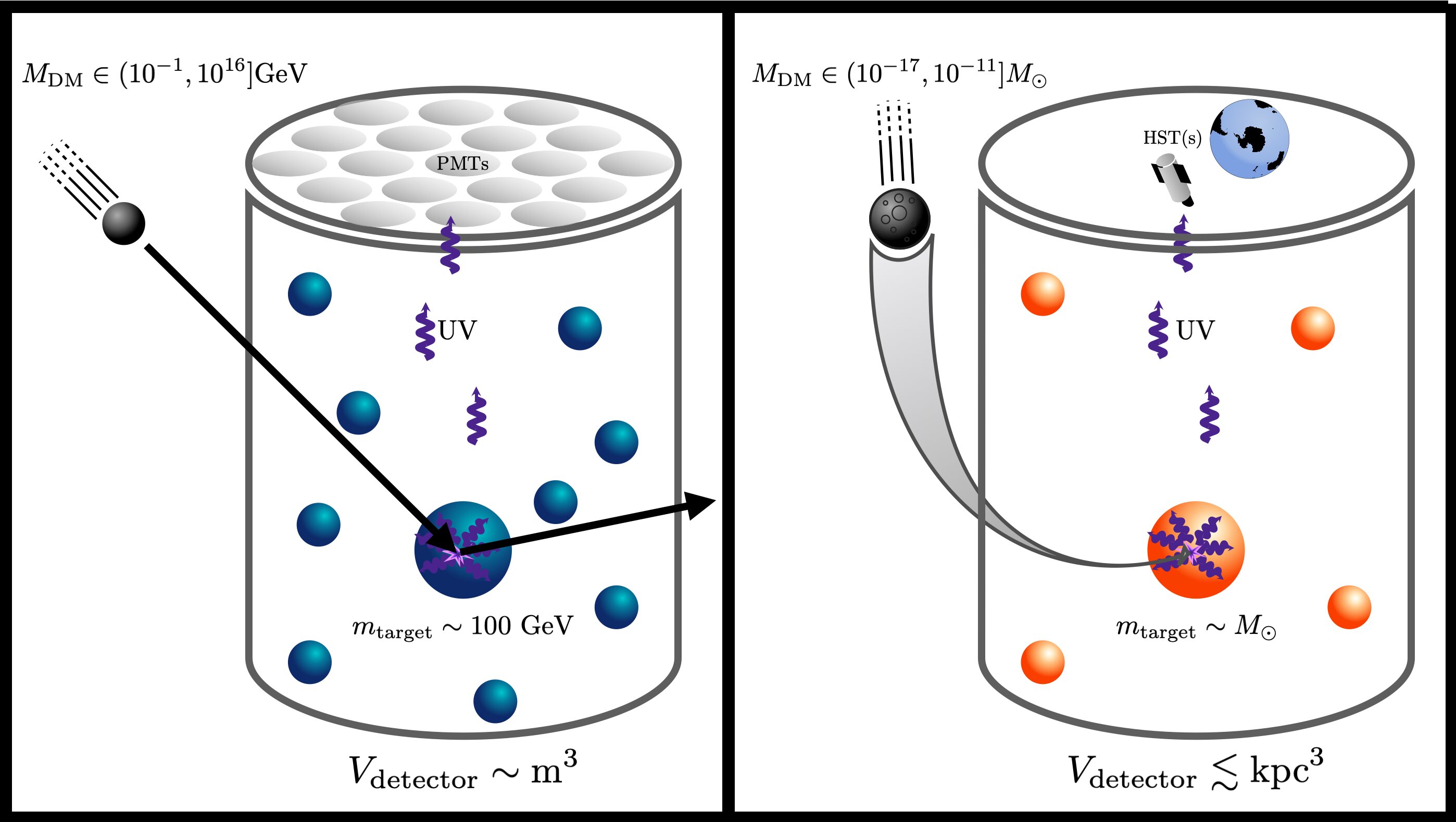 Đồ họa phương pháp dò. Trong một cuộc tìm kiếm truyền thống vật chất tối dạng hạt (trái), các hạt vật chất tối không thấy được va chạm với hạt nhân trong máy dò đặt trên trái đất. Kết quả là năng lượng nảy lại có thể được các máy dò siêu nhạy quan sát được. Tương tự như vậy, các tiểu hành tinh tối có thể va chạm với các ngôi sao (phải), dẫn dến hình thành các sóng xung kích làm nóng bề mặt của chúng. Việc dẫn đến phát xạ tia UV có thể quan sát được bằng các kính viễn vọng trên mặt đất. Credit: Das et al