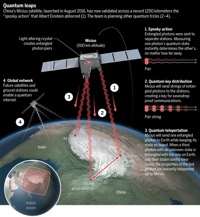 Một nhóm các nhà vật lý Trung Quốc cho biết họ đã gửi được các hạt lượng tử trong trạng thái rối từ vệ tinh tới các trạm mặt đất cách xa 1200 km, phá vỡ kỷ lục thế giới trước đó. Kết quả này là một bước tiến đáng kể để đạt tới truyền thông siêu an toàn và, cuối cùng, là mạng không gian internet lượng tử 1.