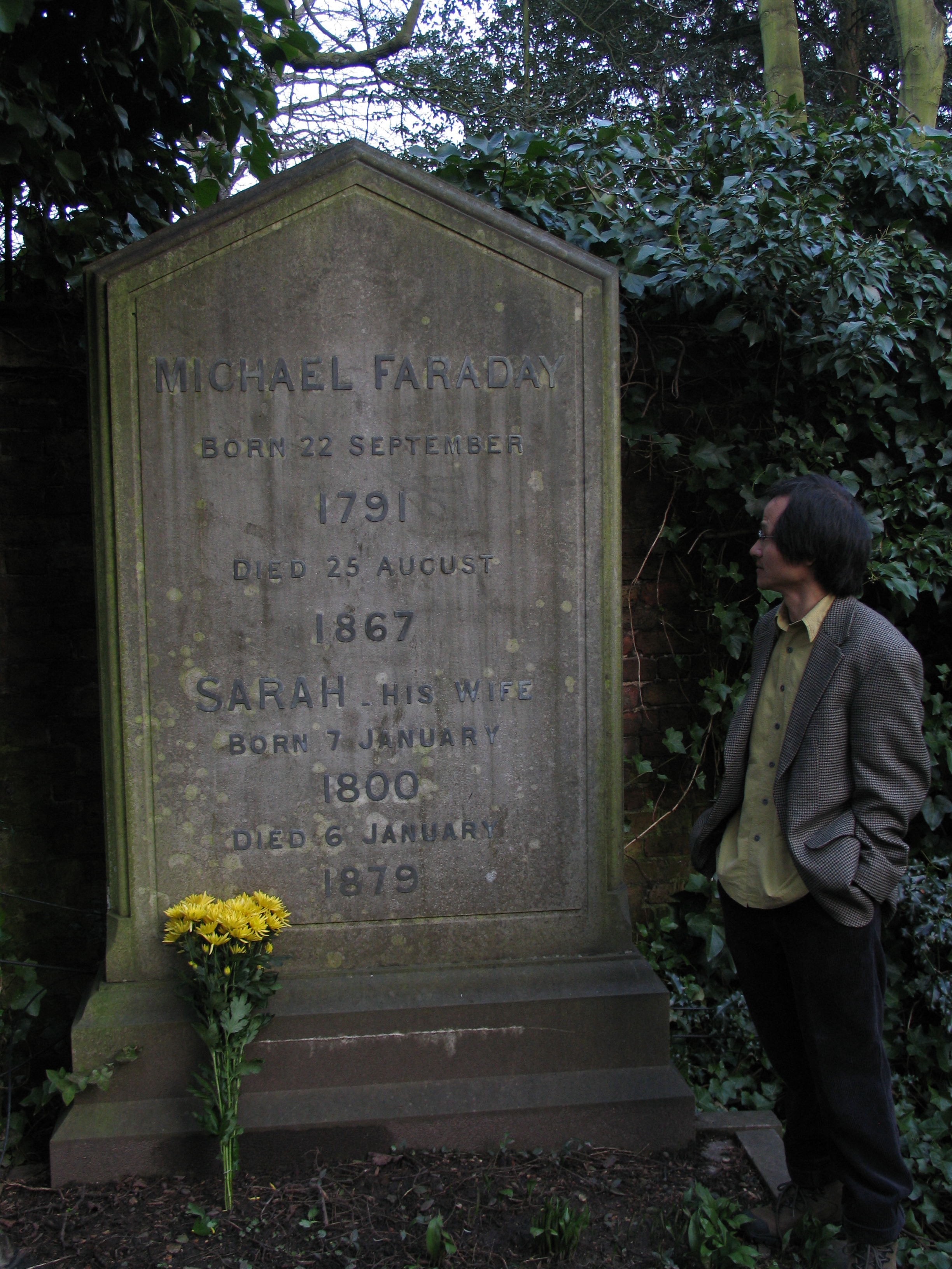 Tôi hơi nhụt chí nhưng nhìn những đoá hoa cúc vàng sáng rực rỡ trên tay, tôi chần chừ không đành lòng và quyết định bước về phía Tây, cổng vào đang đóng và một đám người tụ họp chờ ờ đấy. Một tấm biển báo đề “Tour tham quan vào lúc 3 giờ chiều.” Bấy giờ là 2h40 chiều. Cũng không đến nỗi. Tôi đợi. Ấy là tour cuối cùng trong ngày. Đúng 3 giờ, tôi được bước vào bên trong. Chào đón khách là người điều hành nghĩa trang, một phụ nữ trông đầy lịch lãm. Bà gật gật đầu nhìn mình tỏ vẻ ưng ý, “Ồ, anh có mang cả hoa kia à?” “Tôi đến đây để viếng mộ Faraday.” “Ôi, mộ Faraday không có trong lịch trình hôm nay.” Chần chừ một lát, bà hỏi, “Anh có phải là nhà vật lý không?” “Dạ thưa phải.” “Vậy trường hợp này, tôi sẽ sắp xếp cho anh một hướng dẫn riêng vào cuối điểm tour.”
