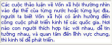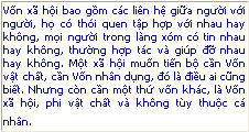 Vốn xã hội là một từ ngữ được dùng từ đầu thế kỷ trước, nhưng được khai triển đầy đủ thành một khái niệm quan trọng khi có người nghiên cứu nhiều quốc gia phát triển kinh tế nhanh hoặc chậm, mà một yếu tố ảnh hưởng tới tốc độ phát triển là phong tục, tập quán, nói chung là đời sống văn hóa. Vốn xã hội bao gồm các liên hệ giữa người với người, họ có thói quen tập hợp với nhau hay không, mọi người trong làng xóm có tin nhau hay không, thường hợp tác và giúp đỡ nhau hay không. Một xã hội muốn tiến bộ cần Vốn vật chất, cần Vốn nhân dụng, đó là điều ai cũng biết. Nhưng còn cần một thứ vốn khác, là Vốn xã hội, phi vật chất và không tùy thuộc cá nhân.