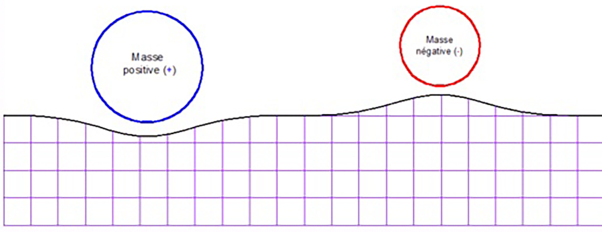 Để hình dung vấn đề chúng ta có thể liên tưởng đến chất bán dẫn. Trong chất bán dẫn, một lỗ trống tạo nên bởi sự dịch chuyển của một electron có thể xem như một khối lượng âm. Lỗ trống cũng có thể xem như một một vị trí vắng của electron đã dịch chuyển lên giải dẫn điện (bande de conduction). Lỗ trống này mang điện tích dương như một positron. Lỗ trống sẽ có khối lượng âm vì khối lượng này nhỏ hơn khối lượng môi trường chung quanh. Dưới tác động của một điện trường electron và lỗ trống chuyển động theo hai chiều khác nhau và tách biệt nhau dưới ảnh hưởng của hấp dẫn.