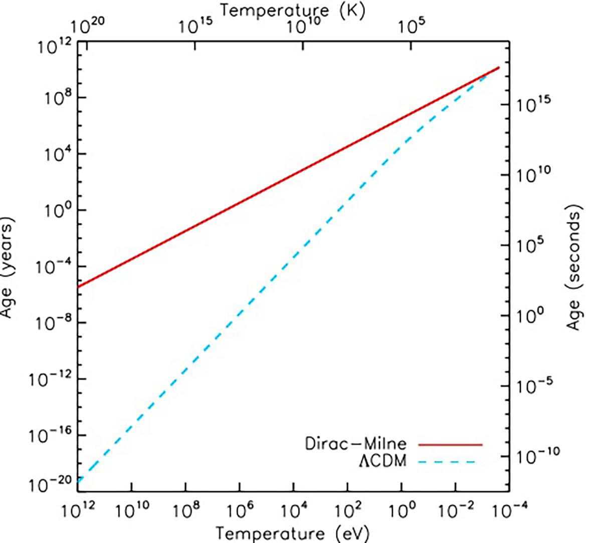 Hình 1. Tuổi của vũ trụ như là hàm của nhiệt độ cho vũ trụ Dirac-Milne (đường liền màu đỏ) và cho vũ trụ /\CDM (đường lấm chấm màu xanh).