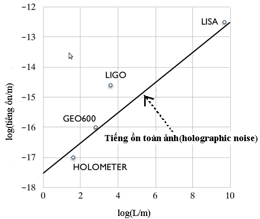 Hình 5. Đường “tiếng ồn toàn ảnh “ biểu diễn căn số trung bình bình phương ( rms-root mean square) của các biên độ thăng giáng toàn ảnh thẳng góc.Trục hoành là log của kích thước L của thiết bị( là khoảng đường đi của ánh sáng). Các giao thoa kế laser tham chiếu là :LISA Laser Interferometer Space Antenna, LIGO Laser Interferometer Gravitational-wave Observatory, GEO600 Laser interferometer với cánh tay dài 600 m.