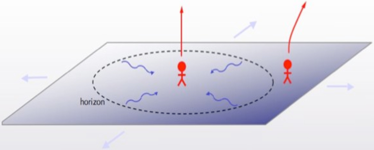 Chúng ta cũng có thể nói đến chân trời vũ trụ (xem hình 1) ngăn cách chúng ta với những vùng vũ trụ chưa biết đến và xem biên chân trời như đường chân trời trong lỗ đen và ta có vùng trong và vùng ngoài của vũ trụ.