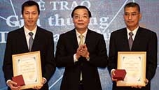Bộ trưởng Bộ KH&CN Chu Ngọc Anh trao giải thưởng Tạ Quang Bửu cho hai nhà khoa học đoạt giải chính GS.TS Nguyễn Văn Hiếu (phải) và PGS.TS Nguyễn Ngọc Minh (trái).