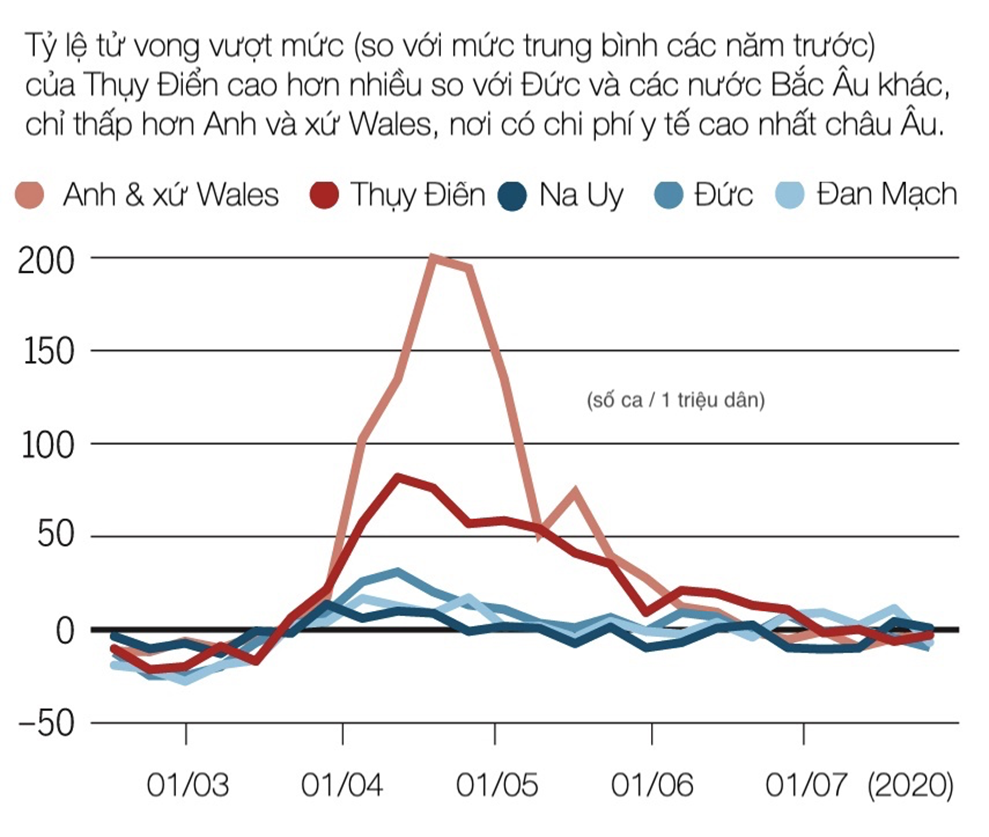 So với số ca tử vong trung bình các năm trước, số ca tử vong vượt mức [được quy kết cho Covid-19] ở Thụy Điển tuy thấp hơn Anh và xứ Wales (nơi mức phí y tế cao nhất châu Âu) nhưng vẫn cao hơn Đức và các nước Bắc Âu khác. Cộng đồng nhập cư ở Thụy Điển chịu ảnh hưởng nặng nề, 111 người từ Somalia và 247 người từ Syria tử vong so với mức trung bình 5 năm trước tuơng ứng là 34 và 93 người.